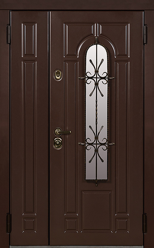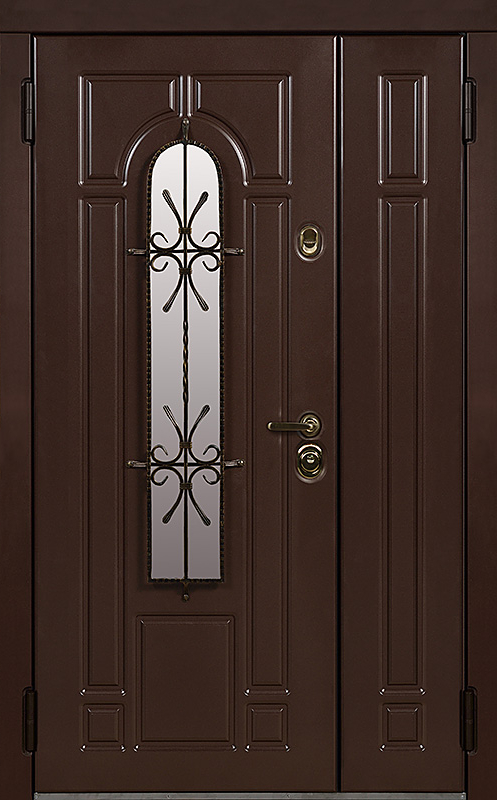 Эта металлическая двухстворчатая дверь с арочным стеклопакетом №15 представляет собой идеальный баланс между эстетикой и прочностью. Арочное стекло добавляет в её дизайн утончённость, а ковка в декоре придаёт изысканный, но в то же время крепкий и надёжный вид. Плита МДФ, используемая как для внешней, так и для внутренней отделки, не только сохраняет прекрасный внешний вид, но и устойчива к механическим повреждениям. Металлическая двухстворчатая дверь с арочным стеклопакетом №15 от производителя: быстрое изготовление и монтаж в Ильинском, индивидуальные размеры, широкий выбор материалов и фурнитуры, официальная гарантия до 10 лет.