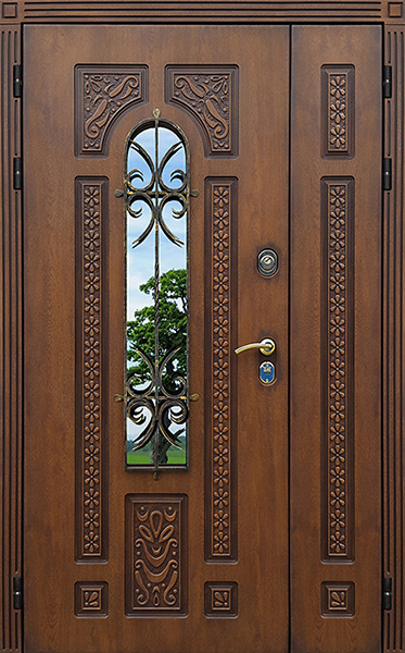 Двойная входная дверь с большим стеклом и ковкой для дома №25 сочетает в себе стиль и надежность, предлагая великолепное решение для вашего дома. Внешняя и внутренняя отделка выполнены из панелей МДФ с ПВХ, что придает двери долговечность и устойчивость к механическим повреждениям, а также способствует легкости ухода. Стеклопакет в комбинации с изысканным кованым узором создаёт не только эстетическое наслаждение, но и позволяет улучшить светопроникновение в помещении. Двойная входная дверь с большим стеклом и ковкой для дома №25 от производителя: быстрое изготовление и монтаж в Ильинском, индивидуальные размеры, широкий выбор материалов и фурнитуры, официальная гарантия до 10 лет.